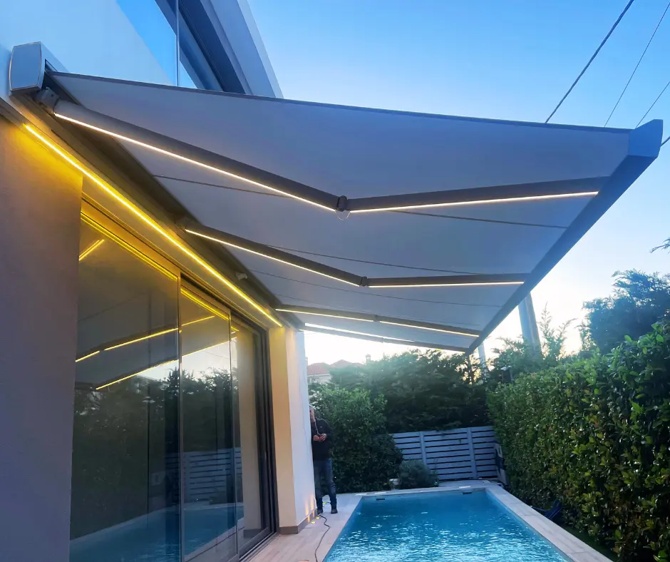 Τα συστήματα φωτισμού LED ενσωματωμένα σε τέντες, πέργκολες και στέγαστρα παρέχουν τόσο λειτουργικό όσο και διακοσμητικό φωτισμό. Ο ζεστός και ρυθμιζόμενος φωτισμός μπορεί να ενισχύσει τη διάθεση και την αισθητική του εξωτερικού σας χώρου.